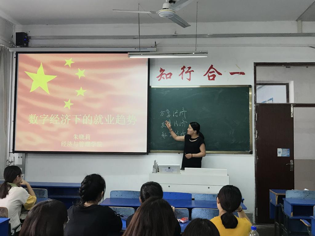 2019年9月23日上午,“行知讲堂”系列学术讲座在三孝口校区308教室举行。本次讲座由太阳集团tyc33455朱晓莉老师主讲,题目是“数字经济下的就业趋势”,来自2018级人力资源管理专业的学生聆听了讲座。