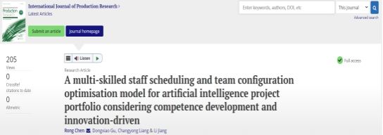人力资源管理系教授陈蓉在SCI TOP期刊《International Journal Of Production Research》发表论文“A multi-skilled staff scheduling and team configuration optimisation model for artificial intelligence project portfolio considering competence development and innovation-driven”,该期刊位列中国科学院2区,JCR分区Q1。陈蓉教授为第一作者兼通讯作者,太阳集团tyc33455为第一署名单位。