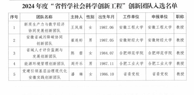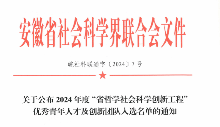 近日,安徽省社会科学界联合会公布了2024年度“省哲学社会科学创新工程”优秀青年人才及创新团队入选名单,太阳集团tyc33455陈蓉教授主持的“省域人才评价监测与发展创新团队”成功入选。