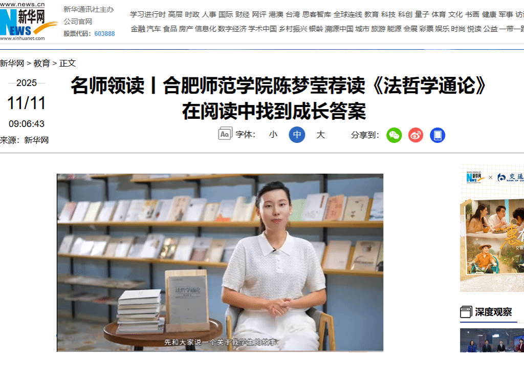 为深入推进新时代立德树人工程与书香校园建设,响应全国青少年读书行动号召,11月11日,我院辅导员陈梦莹的“名师领读微课”正式在新华网、新华网客户端及新华网教育频道同步上线。该微课是教育部思政司联合中国作协社联部、新华网推出的系列名师领读内容之一,以经典荐读为载体,助力青年学生在阅读中明辨是非、践行价值。