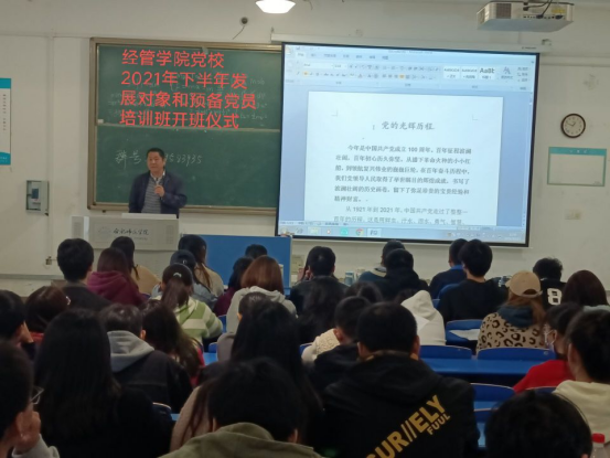 经管学院党委书记、党校校长沈辉同志首先向参加本次培训班的发展对象和预备党员表示祝贺,阐述了本次培训的必要性与重要性。随后沈辉书记对参加培训的学员提出了五点具体要求:一、端正学习态度,安下心来学习;二、通过学习培训,强化政治追求;三、严格要求自己,争做合格党员;四、脚踏实地,牢记青年大学生的使命与担当;五、自觉遵守学习纪律和考勤制度。最后沈辉书记希望学员们要学有所思、学有所悟,学有所得。认真学习党的百年历程,不忘初心和使命,以实际行动向党组织靠拢,在班级发挥带头模范作用。