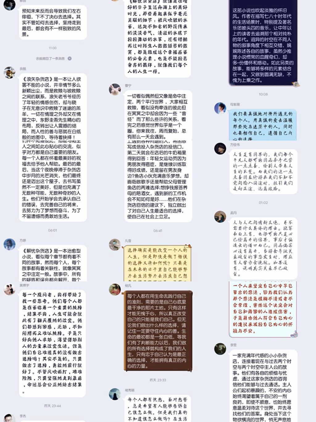 班级学生们围绕小说《解忧杂货铺》展开了讨论。首先由学习委员葛静怡同学介绍了小说的核心内容,之后同学们对小说的主题及传达的内容表达了自己的见解。