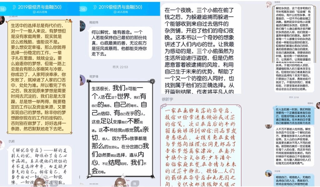 为了提升学生综合素养,引导广大同学养成“爱读书,会读书,乐读书”的良好习惯,我院开展了读书分享活动,为响应活动号召,在活动第二阶段,披沙炼金活动中,滨湖校区2019级经济与金融专业学生在网上开展了“云”读书分享活动。