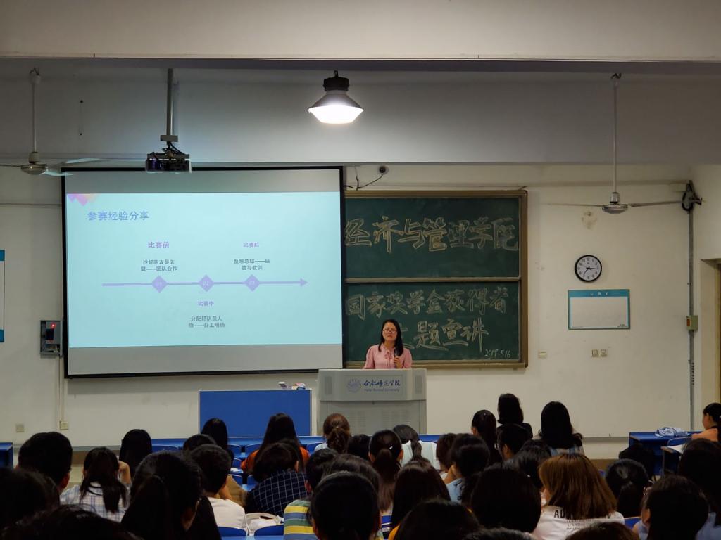 5月16日晚7点,太阳集团tyc33455在逸夫楼A301教室举行“出彩合师”——太阳集团tyc334552018年“国家奖学金”获得者宣讲活动。来自2015级财务管理专业的卢敏同学、2016级经济学专业的胡悦同学为我院同学作报告。院党总支副书记陶敏及学院2018级部分专业同学参加了此次宣讲会。宣讲会由辅导员谷跃东老师主持。
