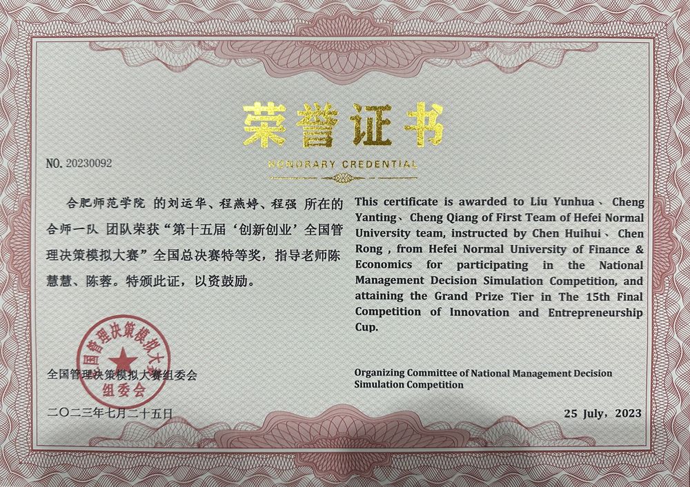 本网讯 7月24日至25日,第十五届“创新创业”全国管理决策模拟大赛总决赛在江西财经大学举行。经过激烈角逐,我院入围全国总决策队伍“合师一队”最终获得总决赛特等奖(参赛学生:刘运华、程燕婷、程强,指导教师:陈慧慧、陈蓉),参赛指导教师陈慧慧和陈蓉获得全国总决赛优秀指导教师奖。