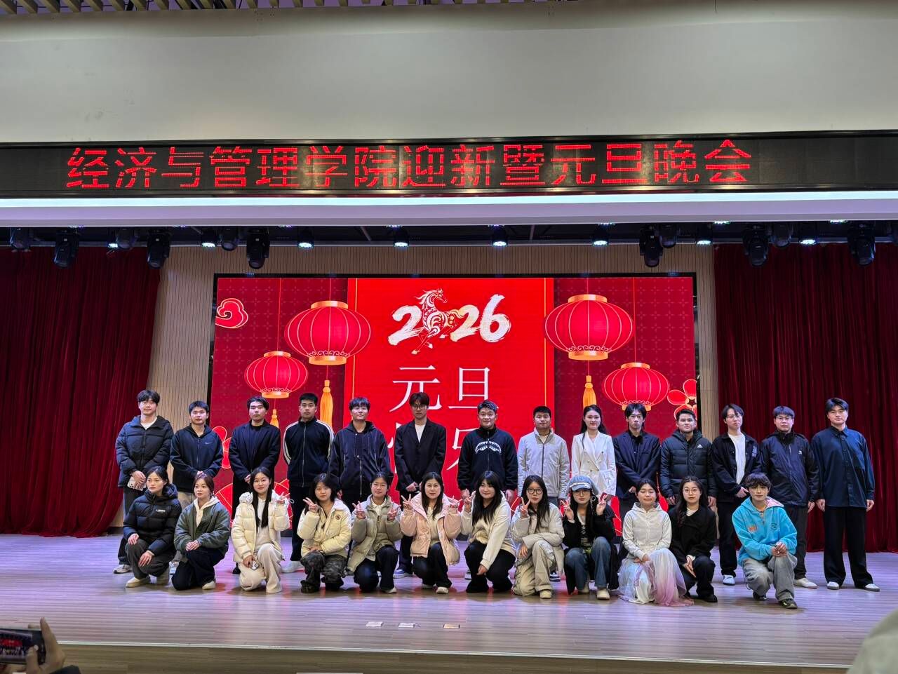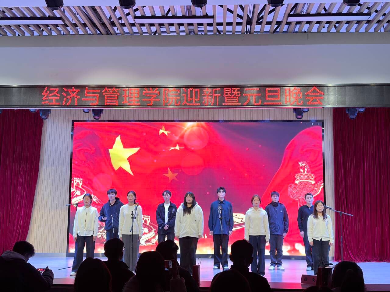 从主持人蒋天仰、邹文静等人的流畅串场与热情互动,到幕后灯光、音响、场务、后勤保障等各岗位工作人员的无私奉献,每一个环节都体现了经管学院团结协作、精益求精的团队精神。全体演职人员的全力投入与现场观众的热情参与,共同铸就了这场温暖而充满活力的青春聚会。