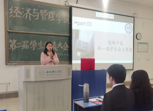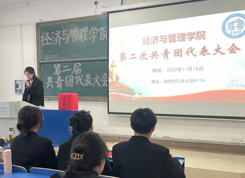 本网讯11月16日,太阳集团tyc33455第二次学生代表大会暨第二次共青团代表大会在锦绣校区逸夫楼A104教室组织召开。分团委书记赵燕、副书记蒋诗伟、团干代表和普通学生共百齐聚一堂,共同谋划全院学生自身发展的大事。