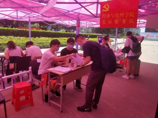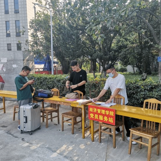 党员服务队,志愿在行动。经管院成立了以书记、副书记为组长,辅导员和学生党员为成员的党员服务队,在校门口迎接回校学生,第一时间解决学生回校问题,做好志愿服务工作。