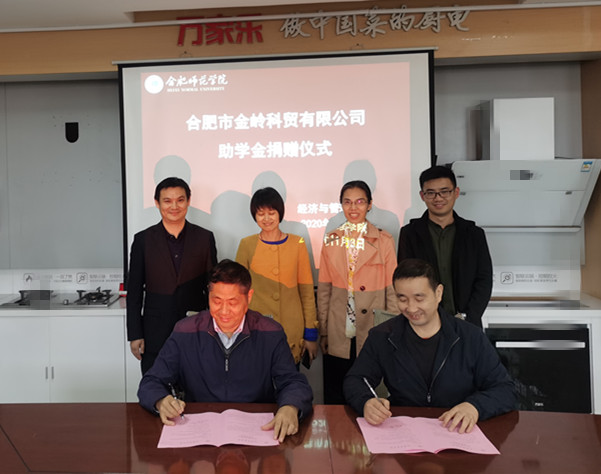 11月3日下午,在合肥金岭科贸有限公司,太阳成集团tyc33455ccww经管学院与合肥金岭科贸有限公司举行了“金岭科贸助学金捐赠仪式”。金岭科贸有限公司总经理姜勇,副总经理、经管学院2008届校友史月娥,经管学院党委书记沈辉,发展规划处(校友办)副处长、校友会秘书长樊彩萍,经管学院教师李志东、辅导员谷跃东出席了捐赠仪式。