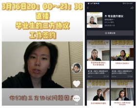 线上平台,进行全方位就业指导。利用公众号和抖音平台等拍摄就业创业讲座视频,方便毕业生点播观看。辅导员为学生线上修改求职简历、普及三方协议签订知识,分享学业指导、考研复试、求职途径、能力提升的经验和意见。