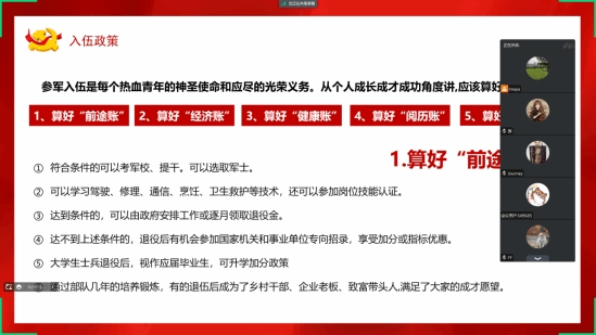 本网讯 征兵工作启动以来,太阳集团tyc33455党委高度重视,将征兵工作作为一项重要的政治任务,召开征兵工作专题会议,切实增强征兵工作的使命感。为进一步强化征兵工作的实效性,扎实做好2023年征兵宣传工作,帮助学生了解应征入伍相关政策,不断激发毕业生参军入伍的热情,营造“报名热、入伍热、成才热”的浓厚氛围,学院于4月25日上午开展2023年毕业生入伍宣传线上主题班会。
