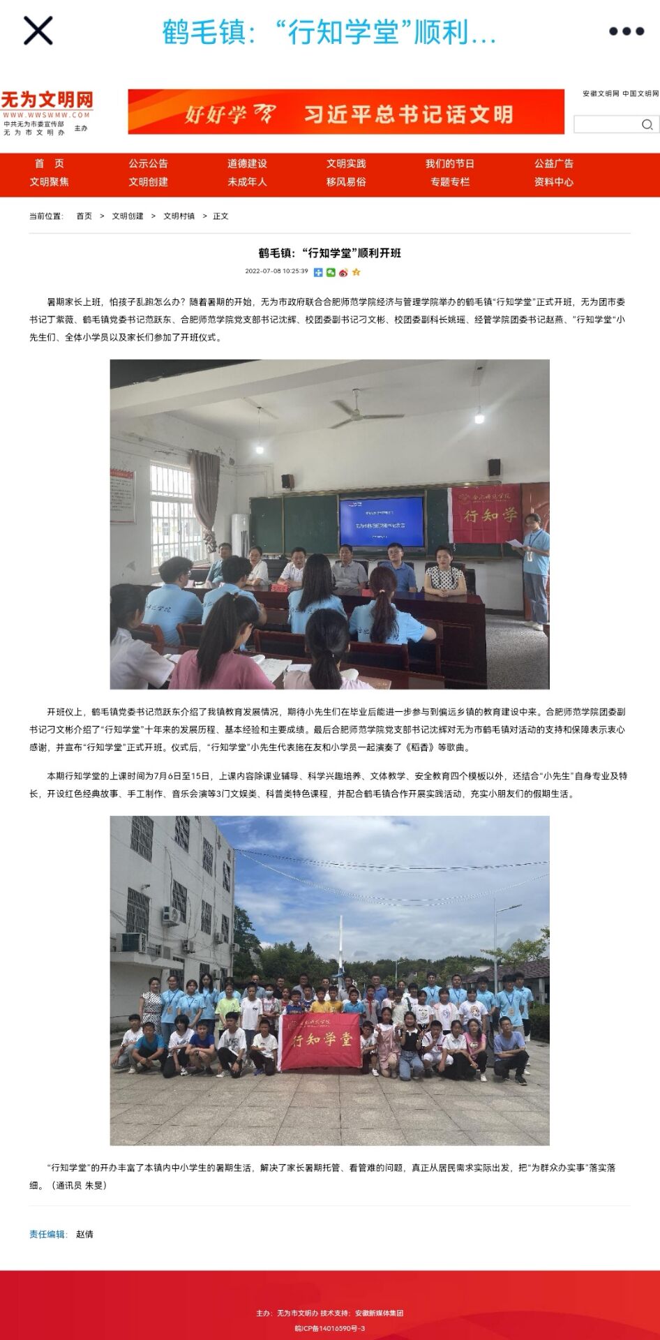 本网讯 今年暑期,在做好疫情防控的前提下,本着“爱满天下,知行合一”的宗旨理念,我校大学生深入安徽省各地开办行知学堂实践活动,通过丰富精彩的课堂活动为各地小朋友们充实暑期生活,也为家长们解决暑期看管难的问题。安徽省无为市本土媒体《无为市文明网》对无为“行知学堂”顺利开展情况进行了拍摄报道,于7月8日上午10时25分在《无为市文明网》上发布了报道内容。(太阳集团tyc33455 何梦媛)