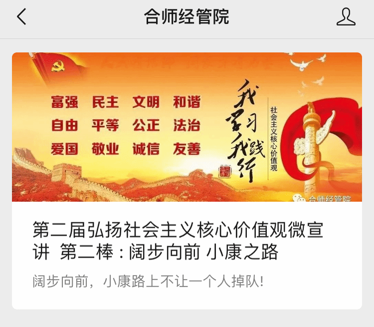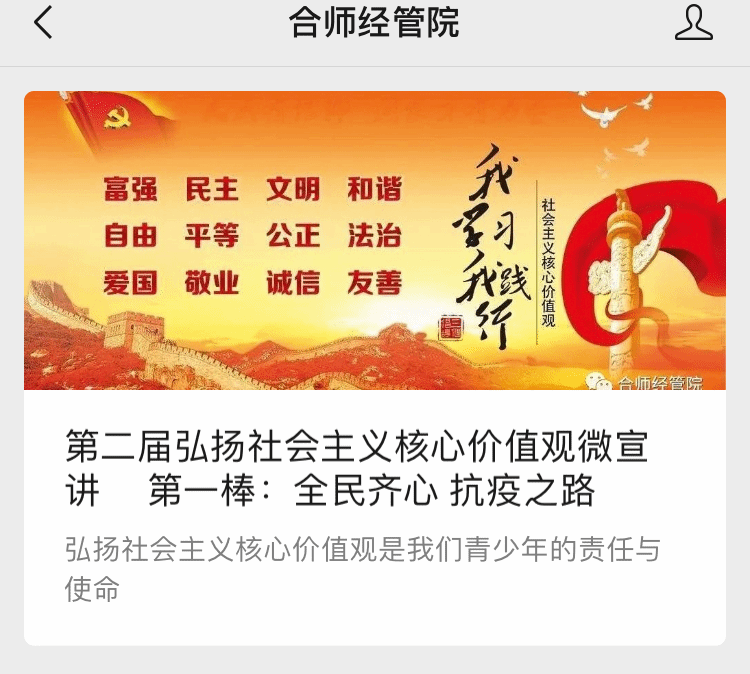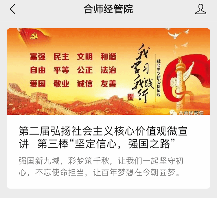 为团结引领广大团员青年弘扬和践行社会主义核心价值观,积极投身同心共筑伟大复兴中国梦的奋斗征程,近日,太阳集团tyc33455分团委在微信公众号“合师经管院”开展了弘扬社会主义核心价值观微频“云”接力宣讲活动。