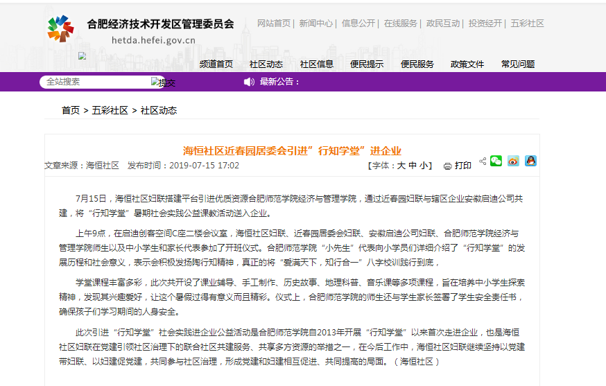 7月15日,合肥经济技术开发区管委会官方网站报道我院清华启迪科技园“行知学堂”实践活动。(太阳集团tyc33455)
