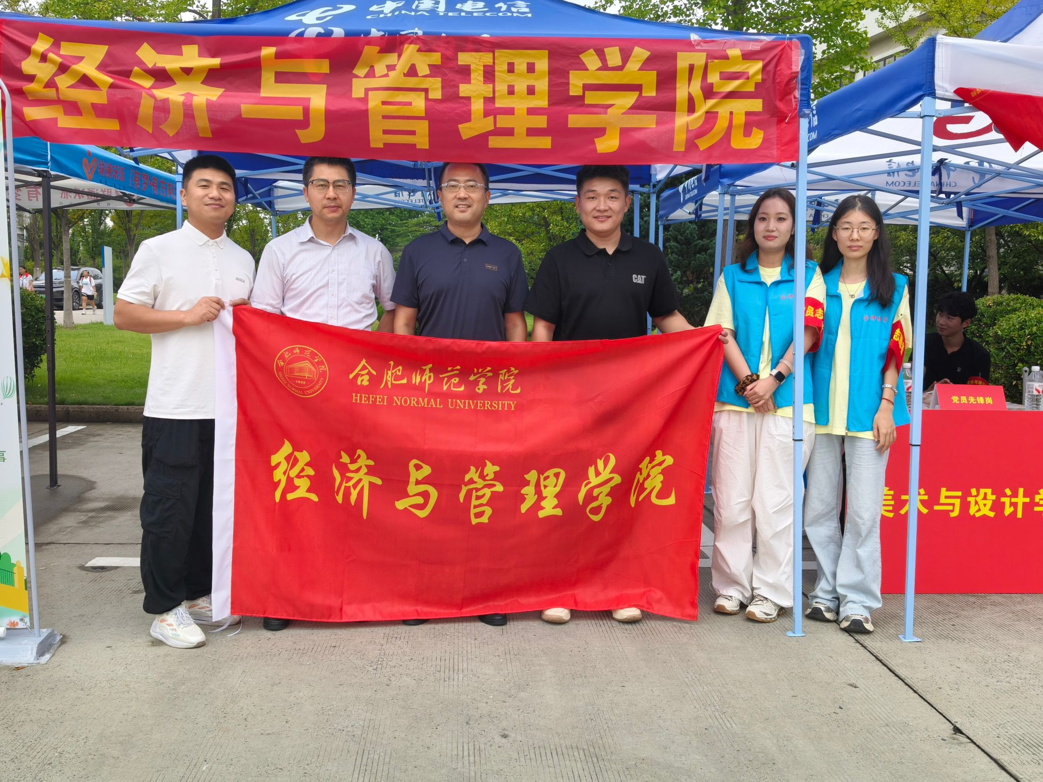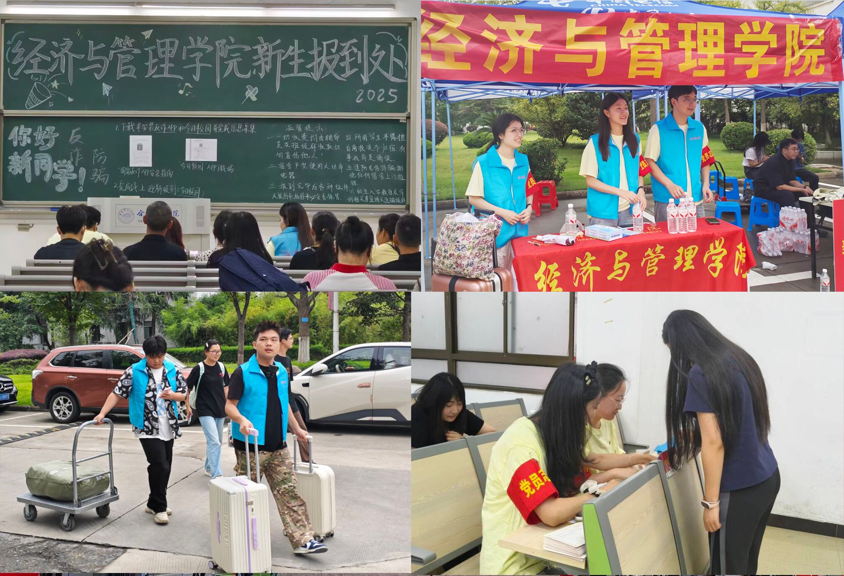 初秋的校园彩旗飘扬,迎新气氛喜庆热烈。晨曦微露,经管学院工作人员早已在锦绣和滨湖两个校区各迎新点位就位。他们身着统一的服装,以饱满的热情投入工作,忙碌而有序地协助新生办理各项入学手续——从身份验证、材料提交,到宿舍引导、校园卡办理,志愿者们始终面带微笑、耐心解答。不少党员志愿者除了帮助搬运行李之外,还主动分享学习和生活经验,帮助学弟学妹们更快熟悉教学楼、食堂、图书馆等场所,传递出浓浓的朋辈关怀情谊。